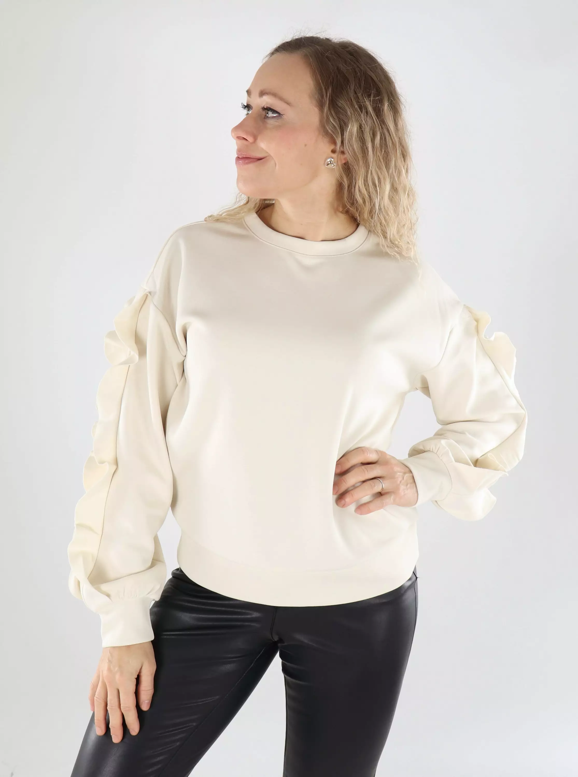 Verleihen Sie Ihrer Alltagsgarderobe mit diesem weichen Sweatshirt einen Hauch von femininer Ausstrahlung! Die auffälligen Rüschendetails an den Ärmelbündchen bringen eine stilvolle Wendung in das klassische Design. Das bequeme und vielseitige Oberteil eignet sich perfekt für entspannte Bürolooks sowie für die Freizeit.