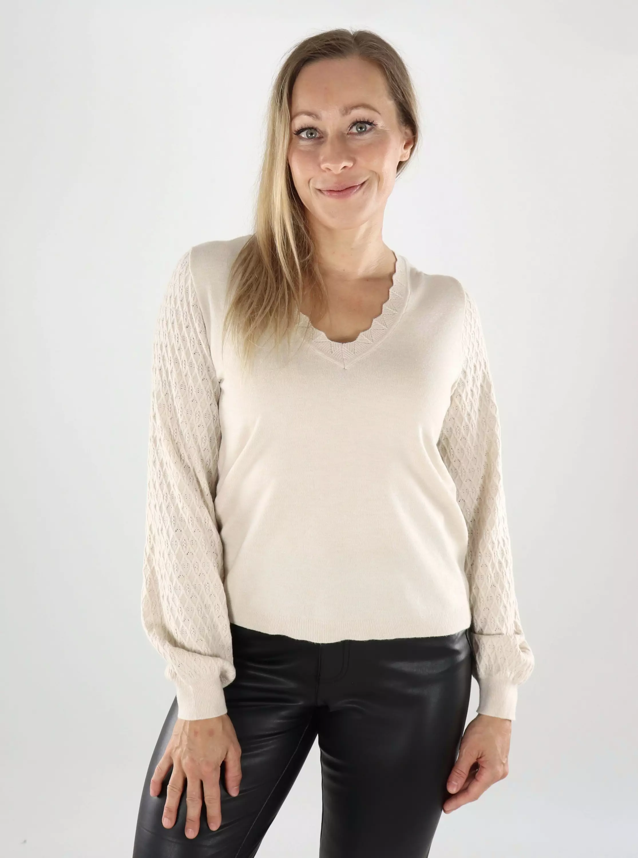 Der unglaublich weiche Pullover von Vila verfügt über schön gemusterte Strickärmel und einen femininen V-Ausschnitt. Lässt sich sowohl zu Jeans als auch zu einem Rock leicht kombinieren!