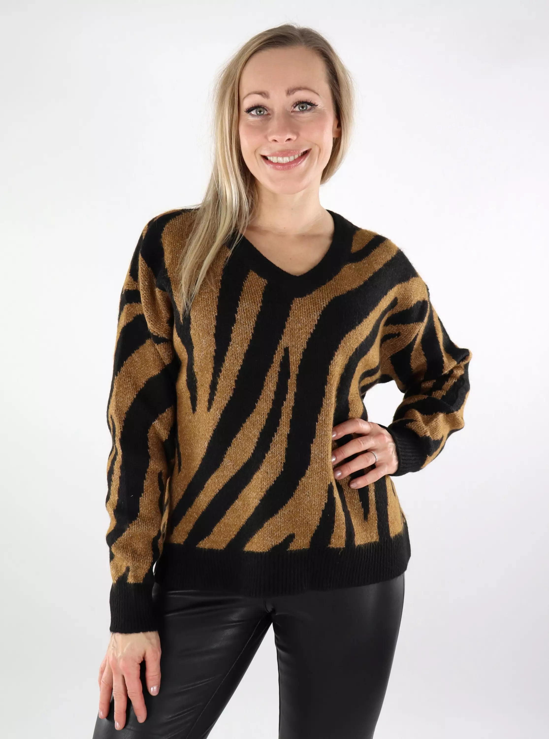 Weicher Pullover mit V-Ausschnitt und schönen Zebra-Mustern.