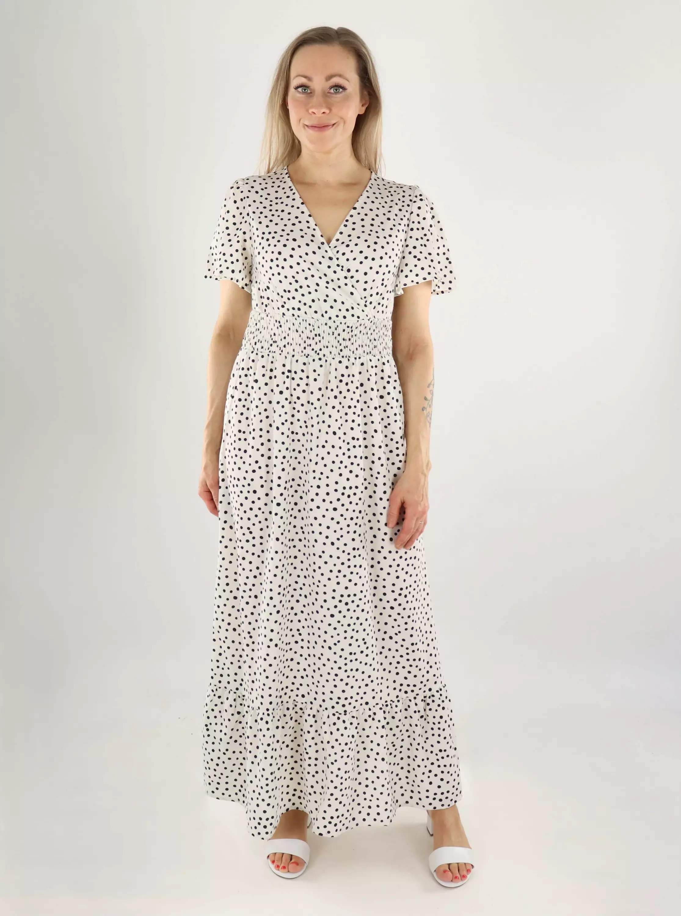 Leichtes und feminines Kleid mit Punkten. Das luftige Material fühlt sich angenehm auf der Haut an und fällt schön. Eine einfache Wahl für den Alltag und festliche Anlässe!
