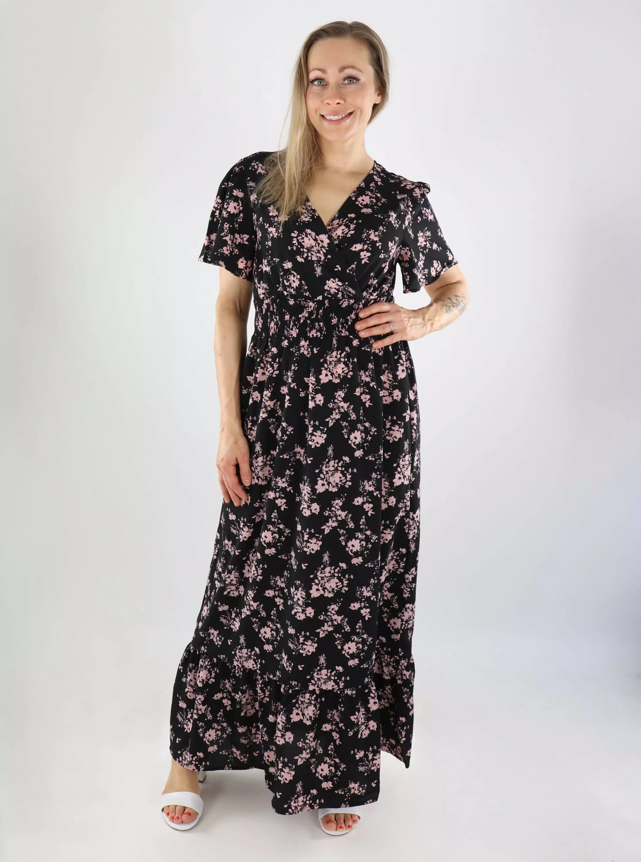 Leichtes und feminines Kleid mit Blumenmuster. Das luftige Material fühlt sich angenehm auf der Haut an und fällt schön. Eine einfache Wahl für den Alltag und besondere Anlässe!