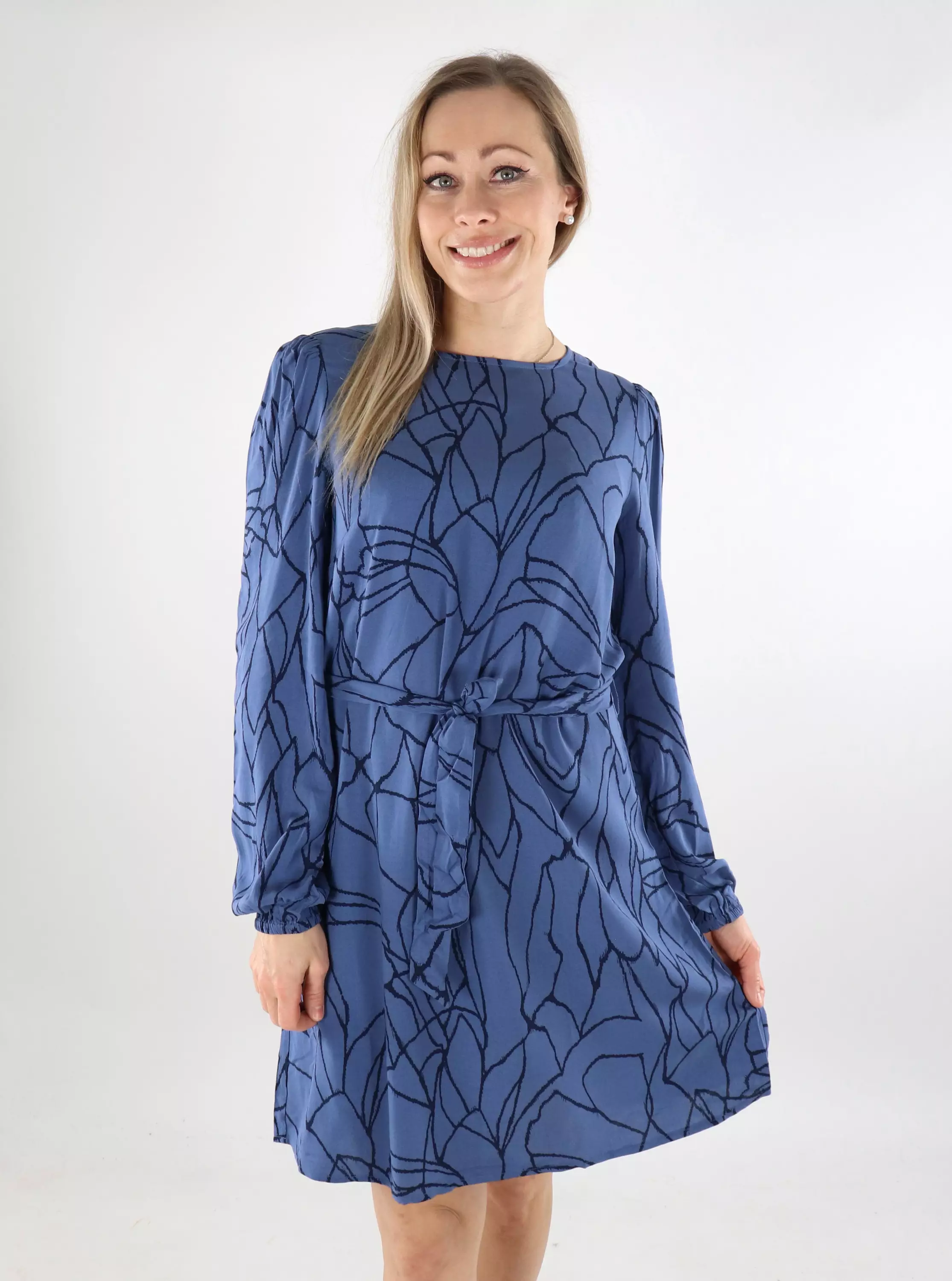 Leichtes Viskosekleid mit schönen Mustern. Abnehmbarer Gürtel in der Taille.