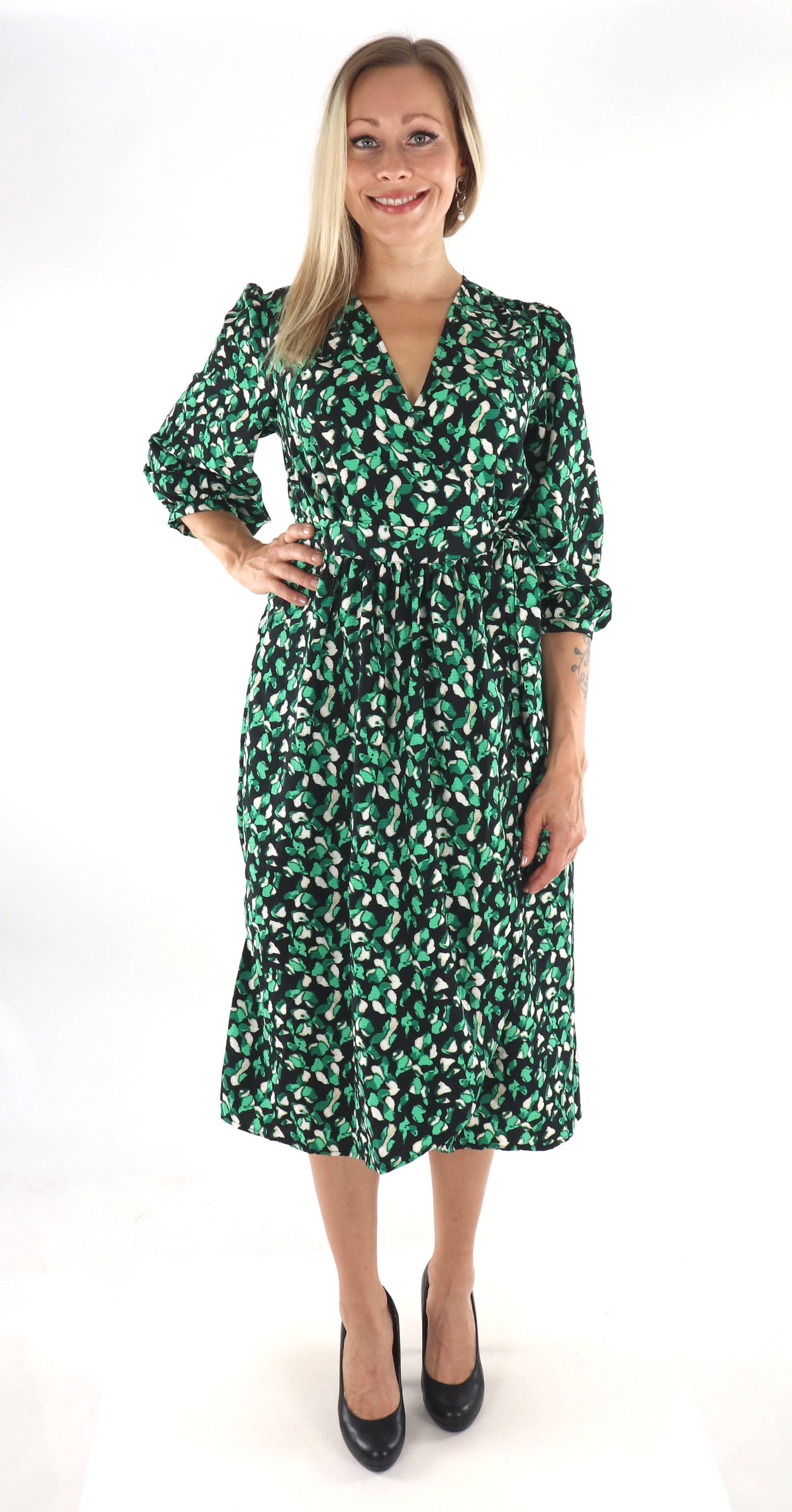 Wunderschönes Wickelkleid mit untergeordneten, leichten Puffärmeln. Hergestellt aus teilweise recyceltem Material