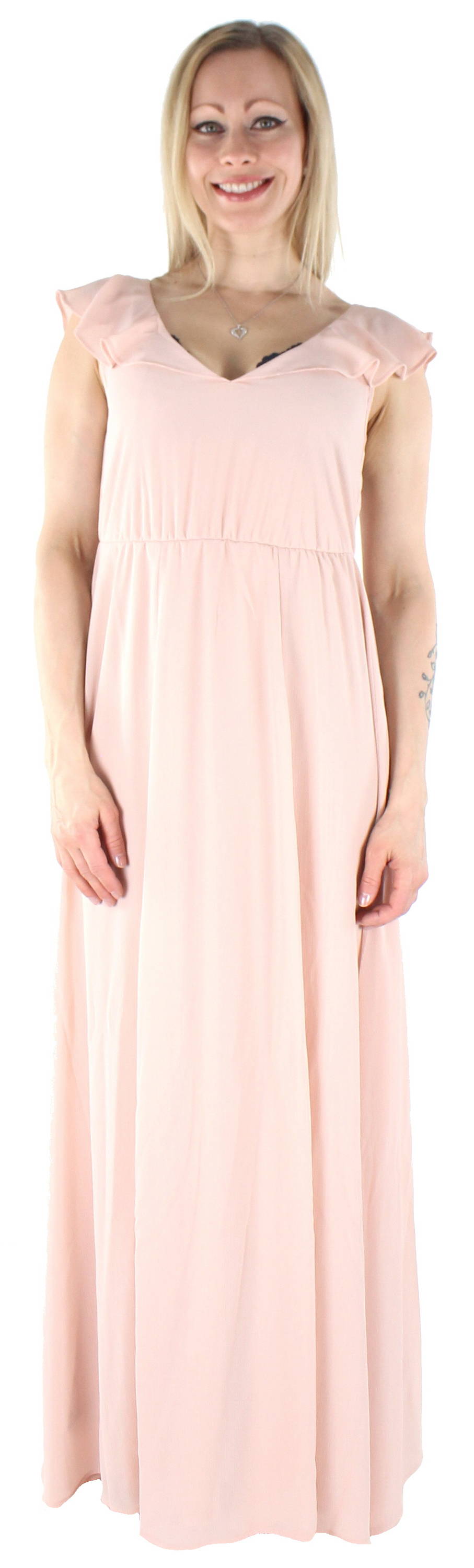 Maxikleid mit Volantkragen in zwei Farben.