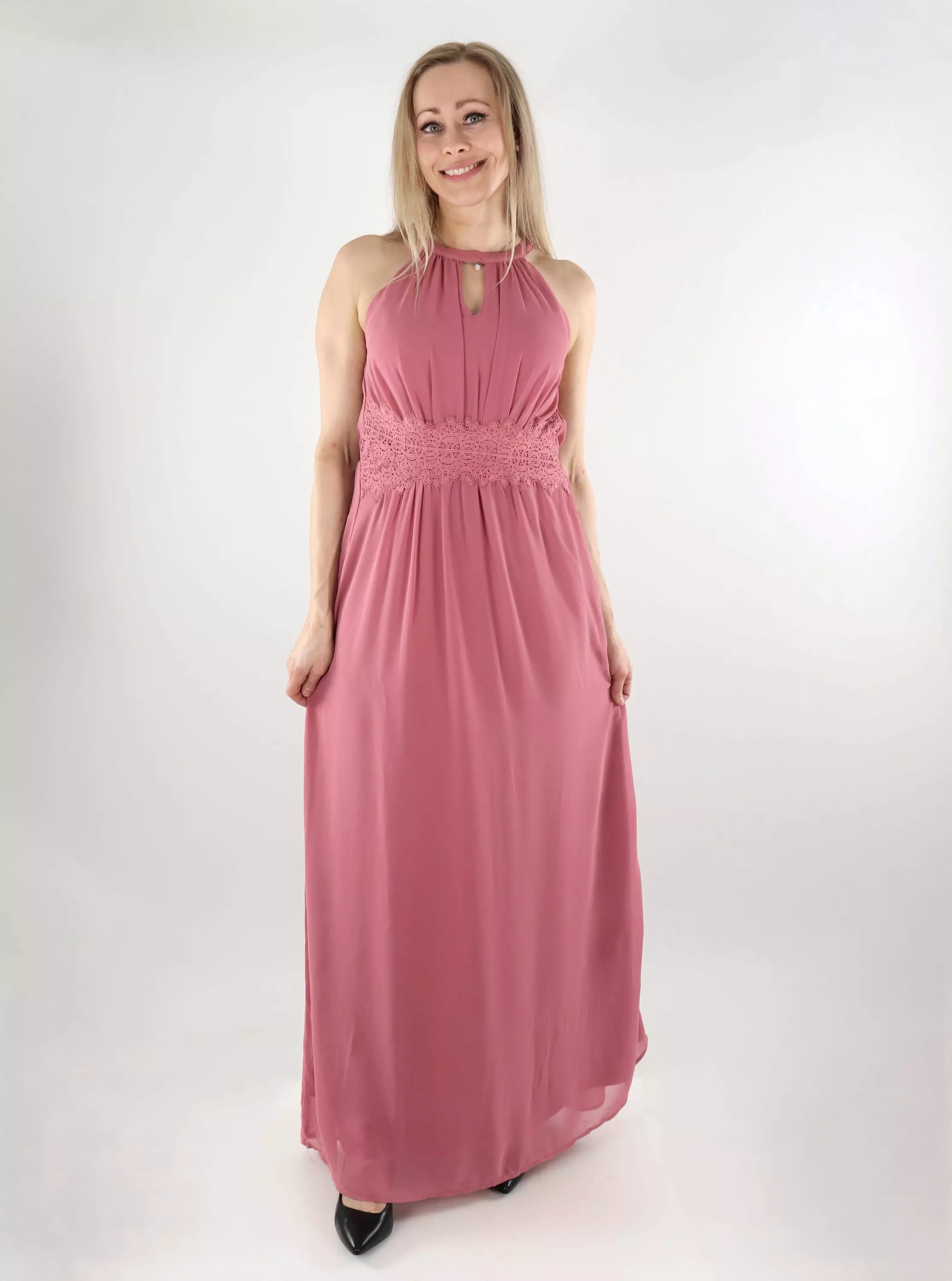 Vila Maxikleid Milina mit Spitzenverzierungen und Halterneck in Mesa Rose/Elastisch