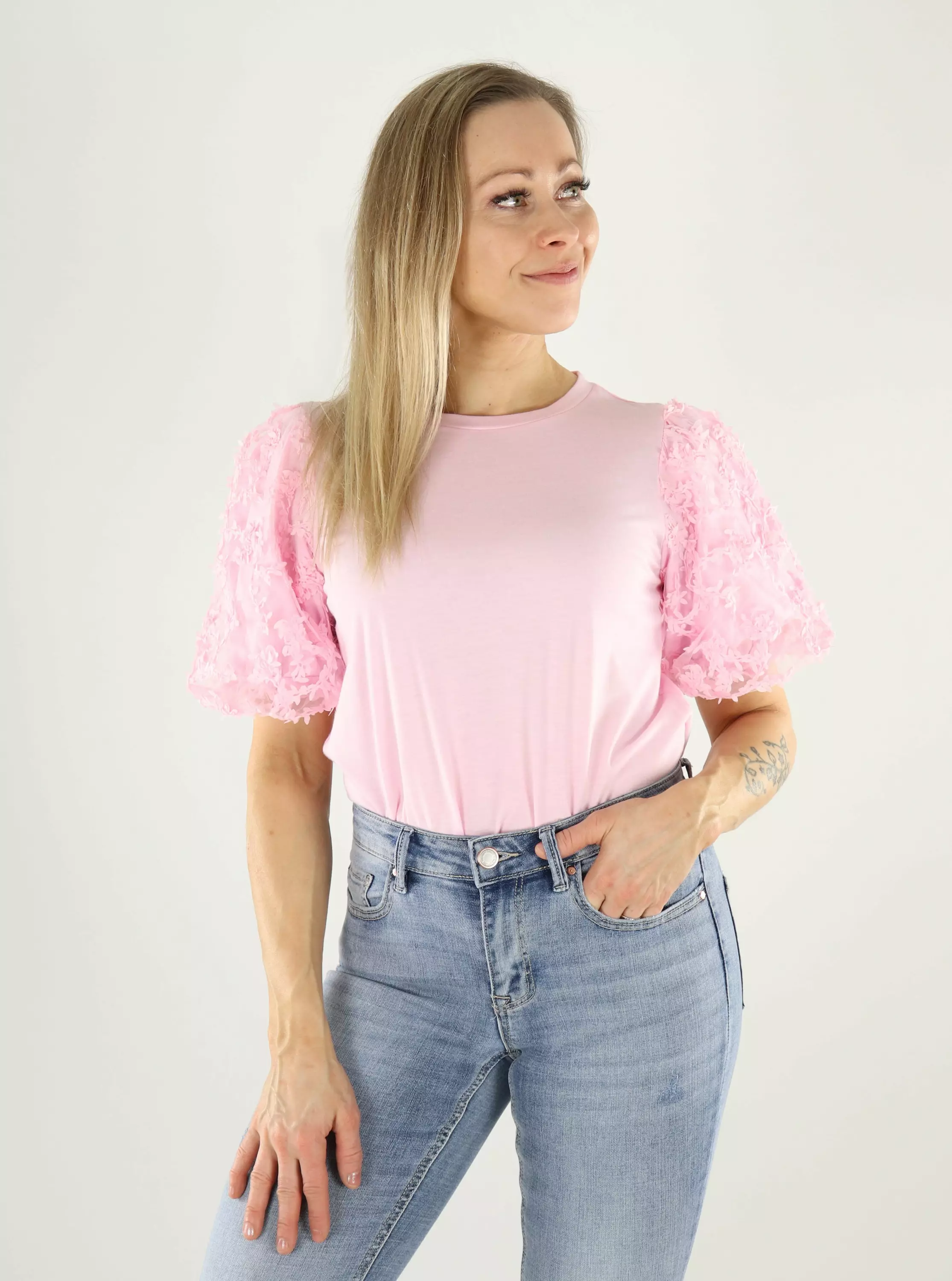 Das lässige und zeitlose T-Shirt von Vila mit wundervollen, voluminösen Spitzensäumen.