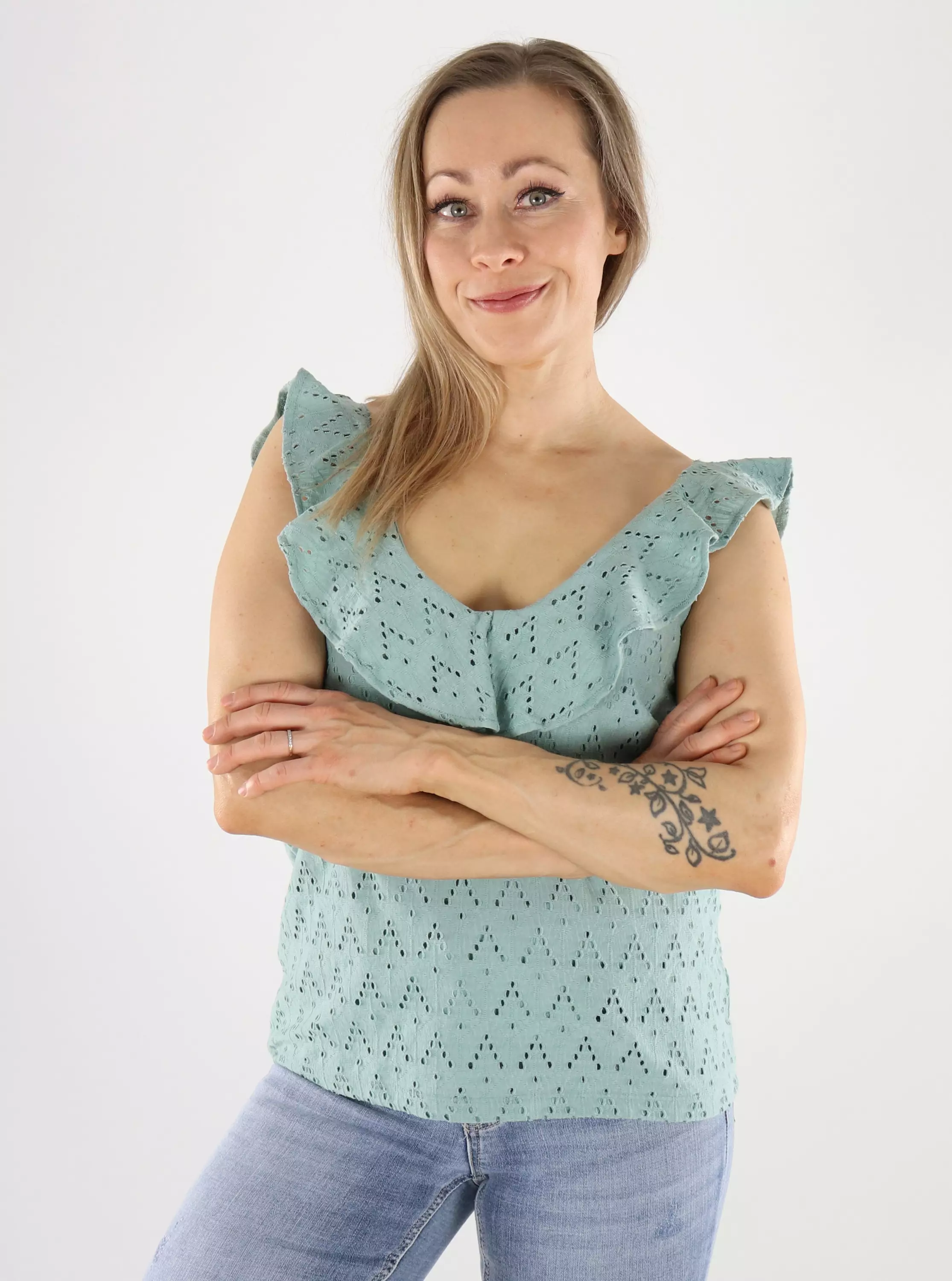 Dieses Damen Top besteht aus einem weichen und elastischen, punktgewebten Stoff, der sich angenehm auf der Haut anfühlt.